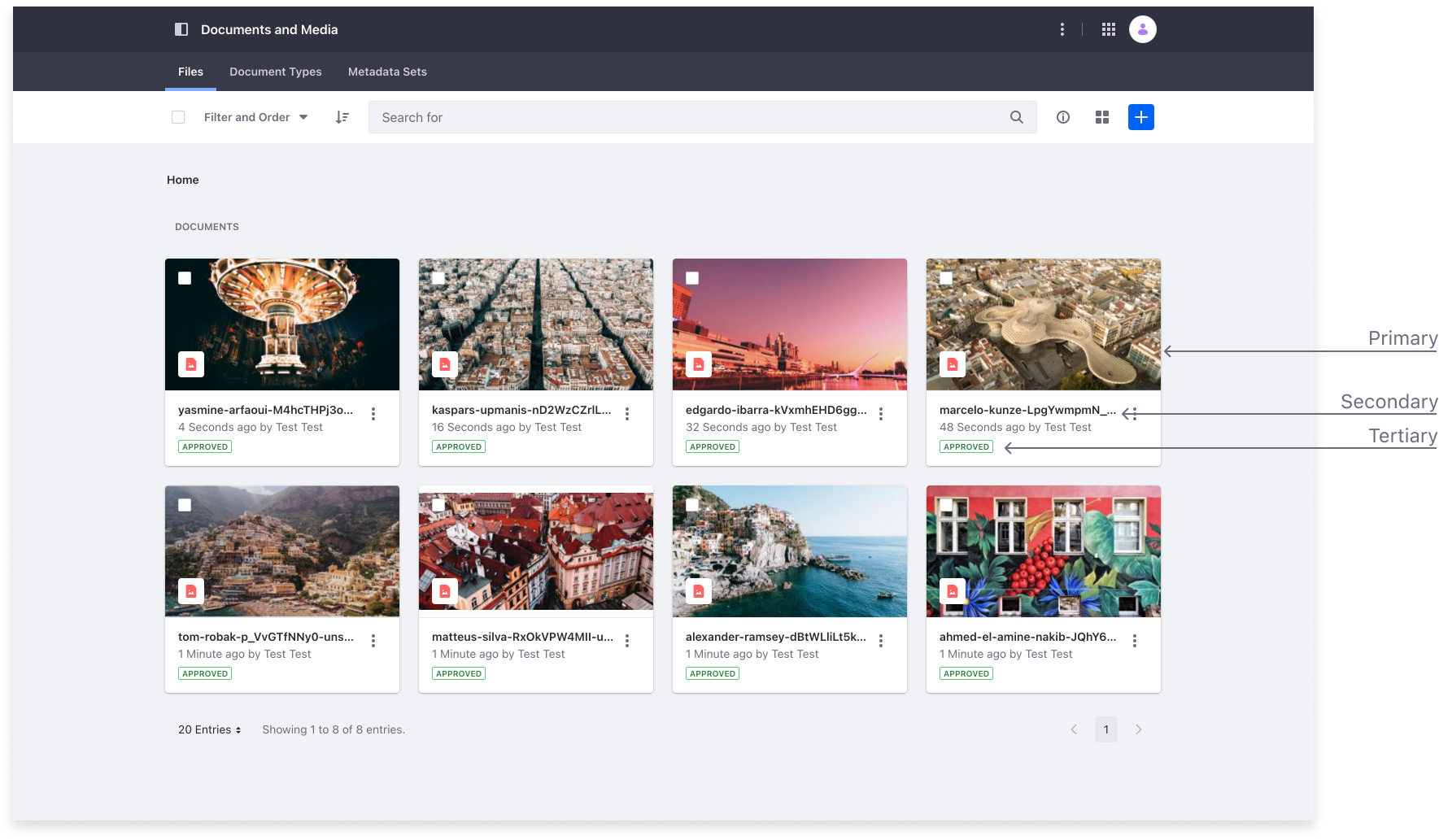 Visual hierarchy is about defining how important the elements in an interface are in relation to one another. But when everything in an interface is competing for attention, the user cannot distinguish what actually matters. Therefore, it is crucial to differentiate primary, secondary, and tertiary elements. In the gallery below, the most important information on the interface is the image, the second one is the image title, and the third is the label that represents the status of this document.