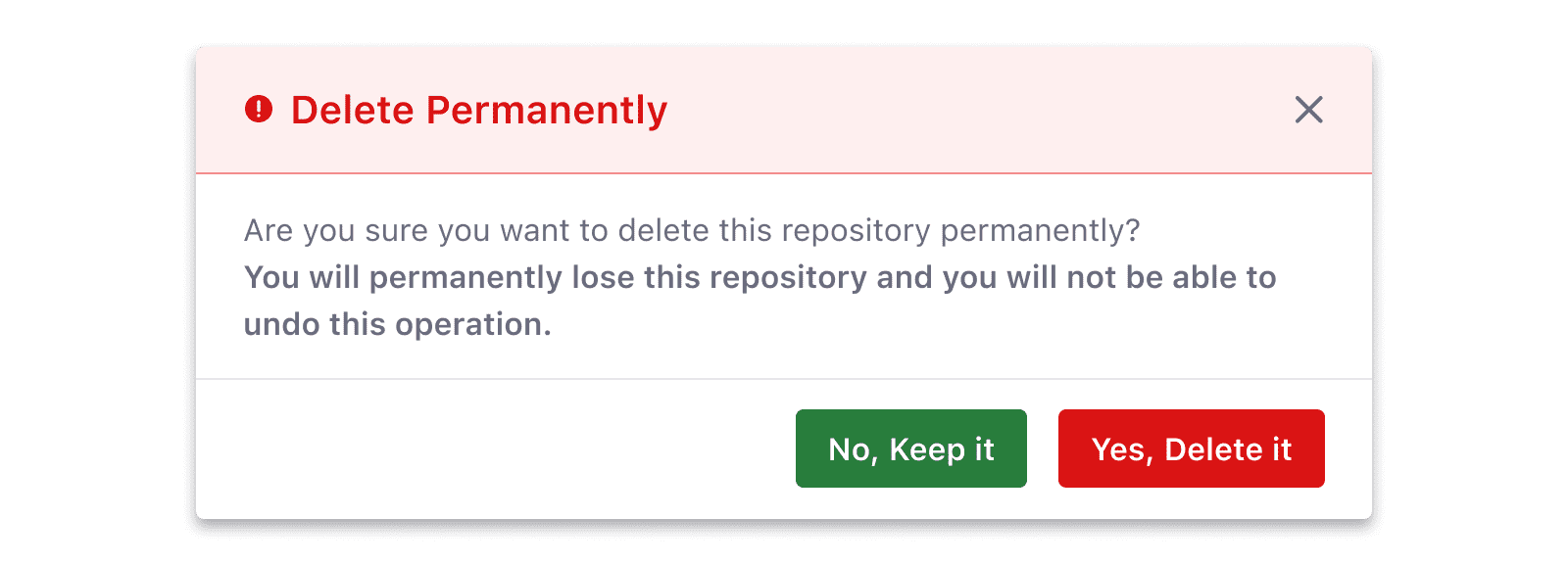 However, action-based color buttons can be used in modals for status messages to accentuate the action and its meaning. But for the sake of consistency and coherency, we recommend always using the same kind of buttons. That is to say, choose between primary color or action-based color buttons in modals for status messages and stick to that.