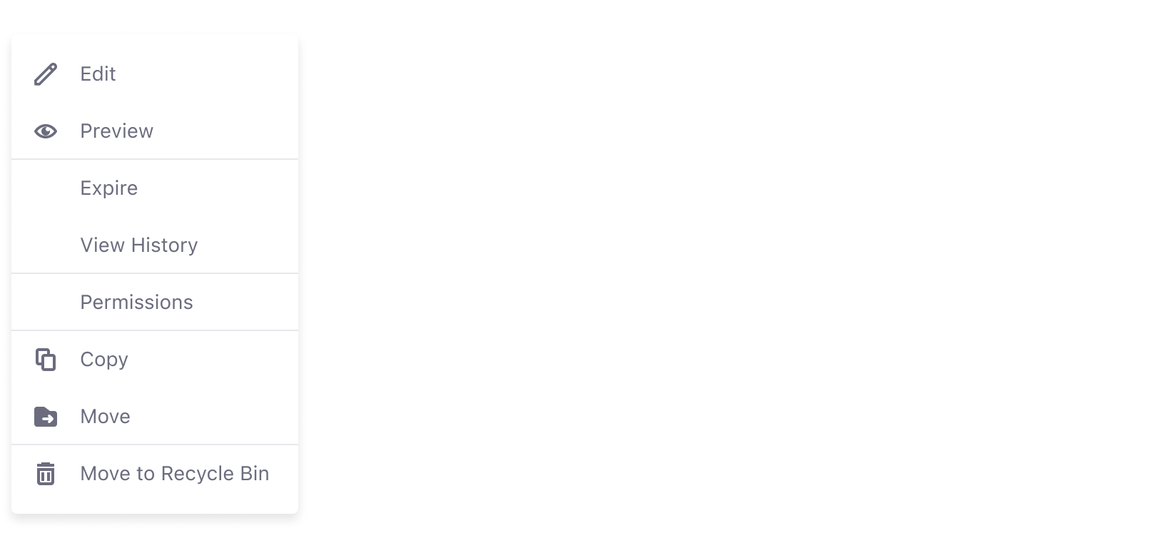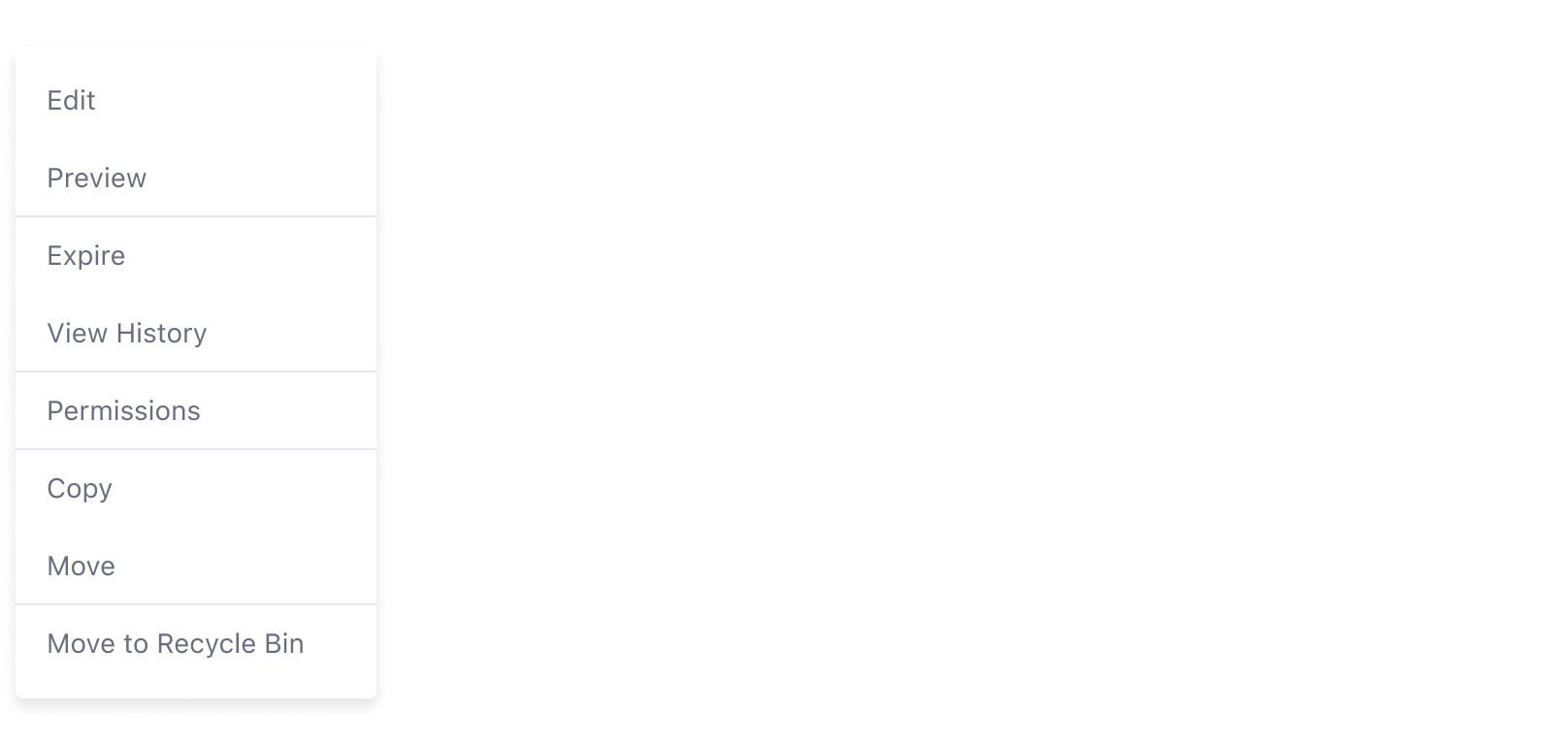 Use a dropdown menu with dividers to keeps actions organized in an actions menu. Organizing the actions by context of use makes it easier for users to find them.