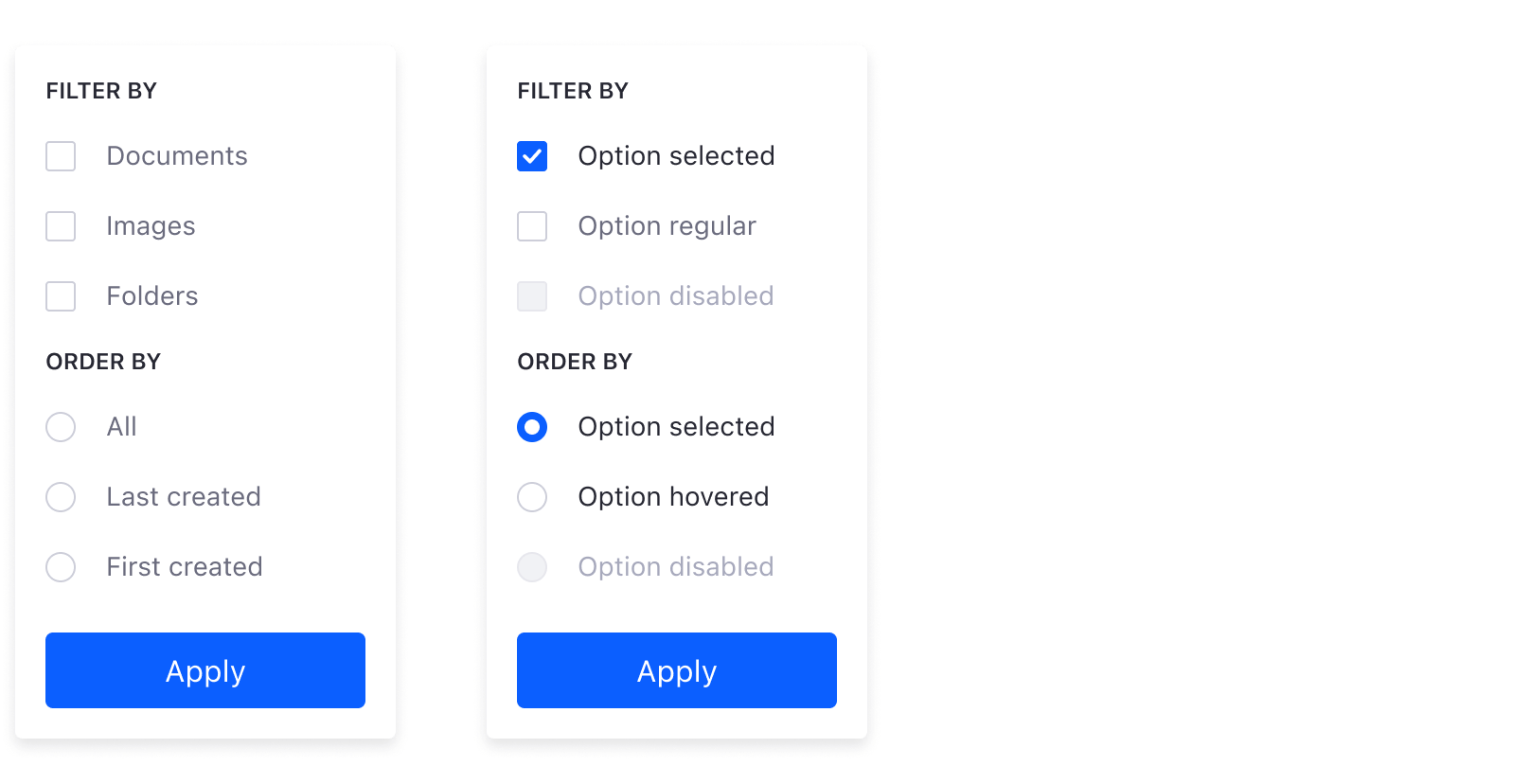 This dropdown menu variation is for use with the management bar Filter and Order dropdown button. This configuration is used to refine the management bar UI options, providing the user with more specific mechanisms to find data.